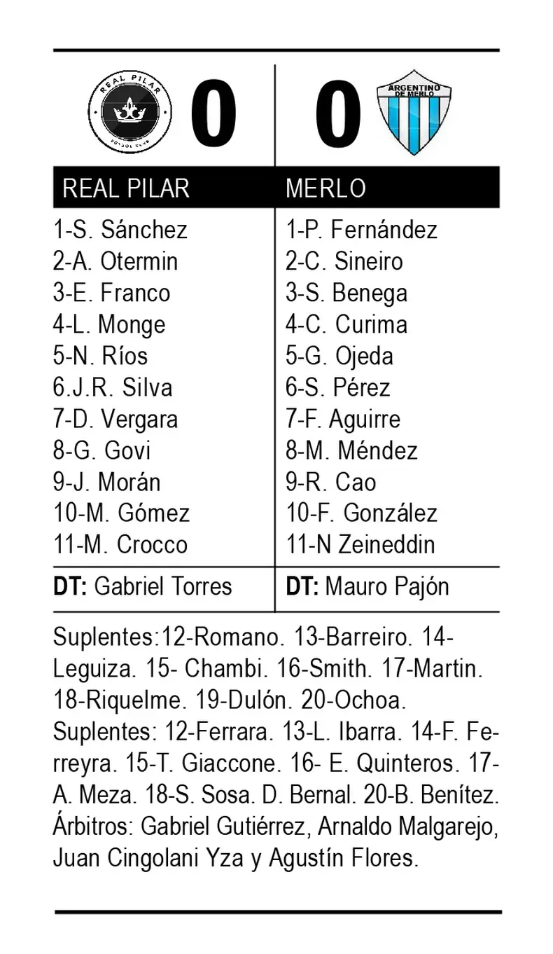 Torres mandó a la cancha a Marcos Riquelme en el segundo tiempo. Abandonó la línea de 3-5 sacando a Ariel Otermin, que sobraba ante las escasas llegadas de Merlo. El Pájaro lo tuvo con una media vuelta sin ángulo a los 10 del complemento y cinco minutos más tarde llegó el aluvión de cambios para ver si esta vez, como ocurrió ante Dock Sud, el juego y los goles llegaban desde el banco.