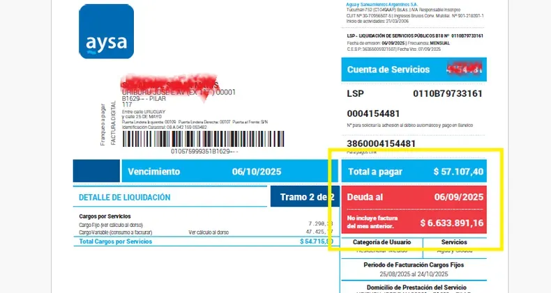 Una vivienda de Pilar recibió la factura de agua corriente más alta de la historia: nada menos que 6,6 millones de pesos, cifra exorbitante que acompañó a la boleta de Aysa.