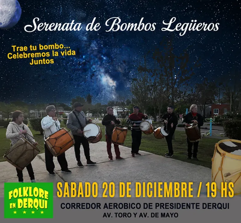"Desde hace unos años atrás, en donde la idea era caminar las calles de la ciudad haciendo sonar los cueros, a modo de la marcha de los bombos que el artesano Froilán González realiza en la provincia de Santiago del Estero, un poco por identidad, un poco por querer imprimirle al encuentro un sello local, nace esta original "Serenata de Bombos Legüeros"", agregaron desde el movimiento "Folklore en Derqui", para agregar que la convocatoria alcanza a todos los "bombistas de la zona que quieran unirse".